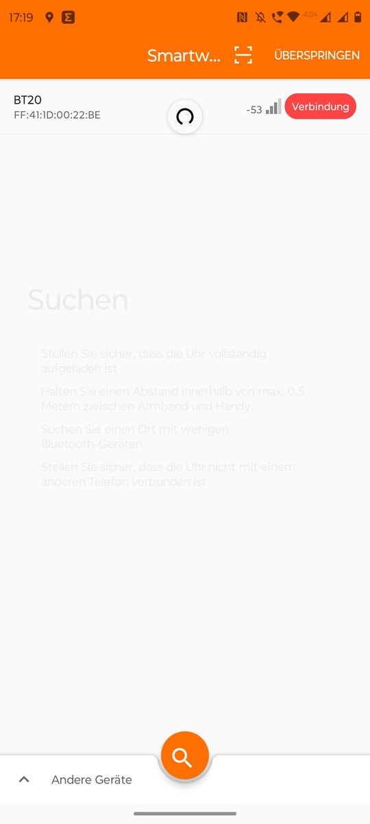 Es una lástima que el nivel de carga de la batería no se muestre en forma de porcentaje en la aplicación o en el menú abreviado del reloj. Para ello hay que acceder a una opción de menú aparte. El BT20 no es compatible con la carga inalámbrica QI. El enchufe de carga con dos clavijas metálicas se fija magnéticamente a la parte inferior del smartwatch. Se incluye el cable de carga con conexión USB-A, pero no la fuente de alimentación correspondiente.