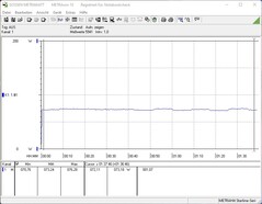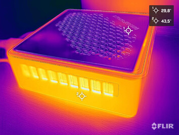 Minisforum utiliza un ventilador axial para la EliteMini HM90, que aspira el aire frío desde arriba y lo dirige hacia abajo, hacia el disipador de calor, para que el aire caliente pueda salir por los lados de la caja. El sistema funciona bien y no hubo caídas de rendimiento debido a las limitaciones térmicas en nuestra revisión. Cuando funcione en un escritorio, los usuarios deben tener cuidado de no colocar nada encima del dispositivo para que se pueda aspirar suficiente aire fresco. El fabricante afirma que utiliza metal líquido para refrigerar la CPU. Sin embargo, no pudimos comprobarlo porque desmontar el sistema puede dañar el SoC. A plena carga, las temperaturas de la CPU alcanzaron los 86.3 °C, aunque la iGPU fue ligeramente más fría con 74 °C. Esto significa que el SoC nunca se calienta demasiado. Si el SoC está bajo carga media, las temperaturas son aún más bajas. Bajo carga sostenida, el rendimiento se mantuvo estable. El resultado del benchmark 3DMark11 es casi idéntico al del arranque en frío y sólo varía en unos pocos puntos dentro de las tolerancias de medición.