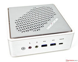 Nuestro dispositivo de análisis tiene 16 GB de RAM y un SSD de 256 GB. El PC viene con Windows 10 Professional (el kit barebones no). Todo está contenido en una pequeña caja con las siguientes dismisiones: 149 x 55 x 149 (ancho x fondo) milímetros. Así, el Minisforum EliteMini HM90 es un poco más grande que el Cubi 5 M10 de MSI. Pero el Intel NUC 10 es un poco más compacto en términos de dimensiones