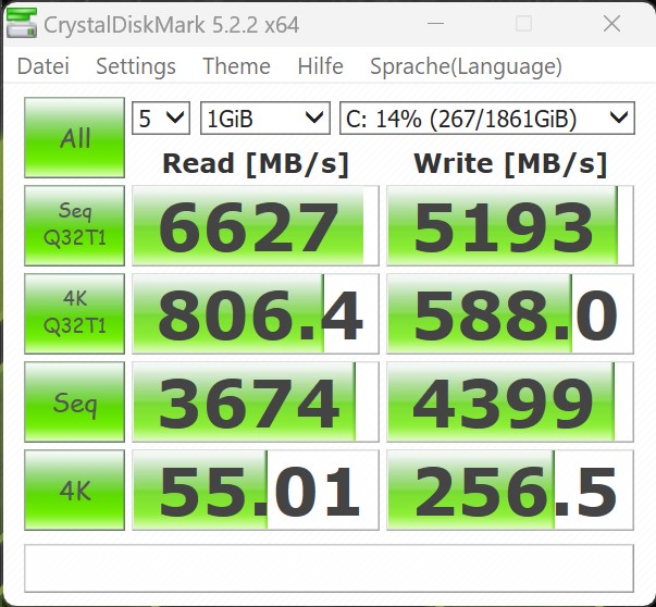 Nuestra unidad de pruebas está equipada con un SSD Samsung NVMe superveloz. El Samsung 980 Pro es uno de los SSDs de consumo más rápidos. Esto es algo que también podemos ver en las pruebas: la unidad superó casi consistentemente a las soluciones de almacenamiento de los dispositivos de la competencia. Sólo el Kingston Fury Renegade en el Intel NUC13 Raptor Canyon fue capaz de superar el rendimiento del Samsung 980 Pro en AS-SSD Benchmark. Dicho esto, es suficiente para que la SSD de Samsung quede primera en la clasificación general. Incluso durante la prueba de estrés, la unidad consiguió mantener una alta velocidad de lectura durante un periodo prolongado, lo que indica que la refrigeración de la SSD es muy eficaz.