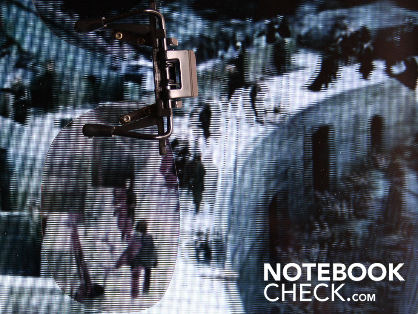 Para este portátil debemos diferenciar entre los ángulos de visión con y sin el efecto 3D. Primero sin los lentes polarizados: los ángulos de visión horizontales son muy buenos. Incluso de un ángulo de visión de 60 grados al lado derecho o izquierdo, los colores se mantienen estables. Los ángulos de visión verticales son mucho peores; los colores comienzan a invertirse después de una desviación de tan solo 10 grados del ángulo de visión ideal. A 45 grados apenas podrá notar algo en la pantalla. Por ello, el portátil es eminentemente apto para una sesión de DVD con amigos, mientras que el nivel de visión de todos esté mas o menos al mismo nivel.