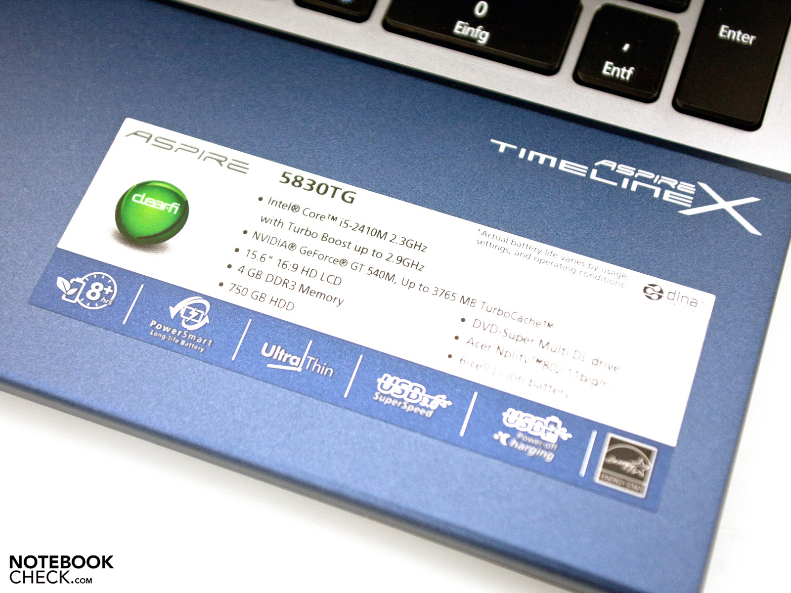 Acer eligió nuevo hardware para sus modelos más recientes. Por tanto, la serie TimelineX ahora estará equipada con los CPUs Intel Sandy Bridge. Nuestro modelo de prueba, el 5830TG, vino equipado con un Intel Core i5-2410M (CPU dual-core con una frecuencia de 2,3 GHz, que puede ser acelerado hasta 2,9 GHz usando el Turbo Boost 2.0). El CPU fue mejor soportado por el nuevo chip gráfico de clase media, la Nvidia GeForce GT 540M que posee 2 GB de memoria DDR3. Gracias a la gran batería de 6 celdas, con 66 Wh, y Nvidia Optimus (que permite la alternación entre el chip gráfico dedicado y el chip gráfico del CPU), la duración de la batería debe ser capaz de durar 8 horas o más. Nota: la batería está integrada al portátil y no puede ser removida directamente.
