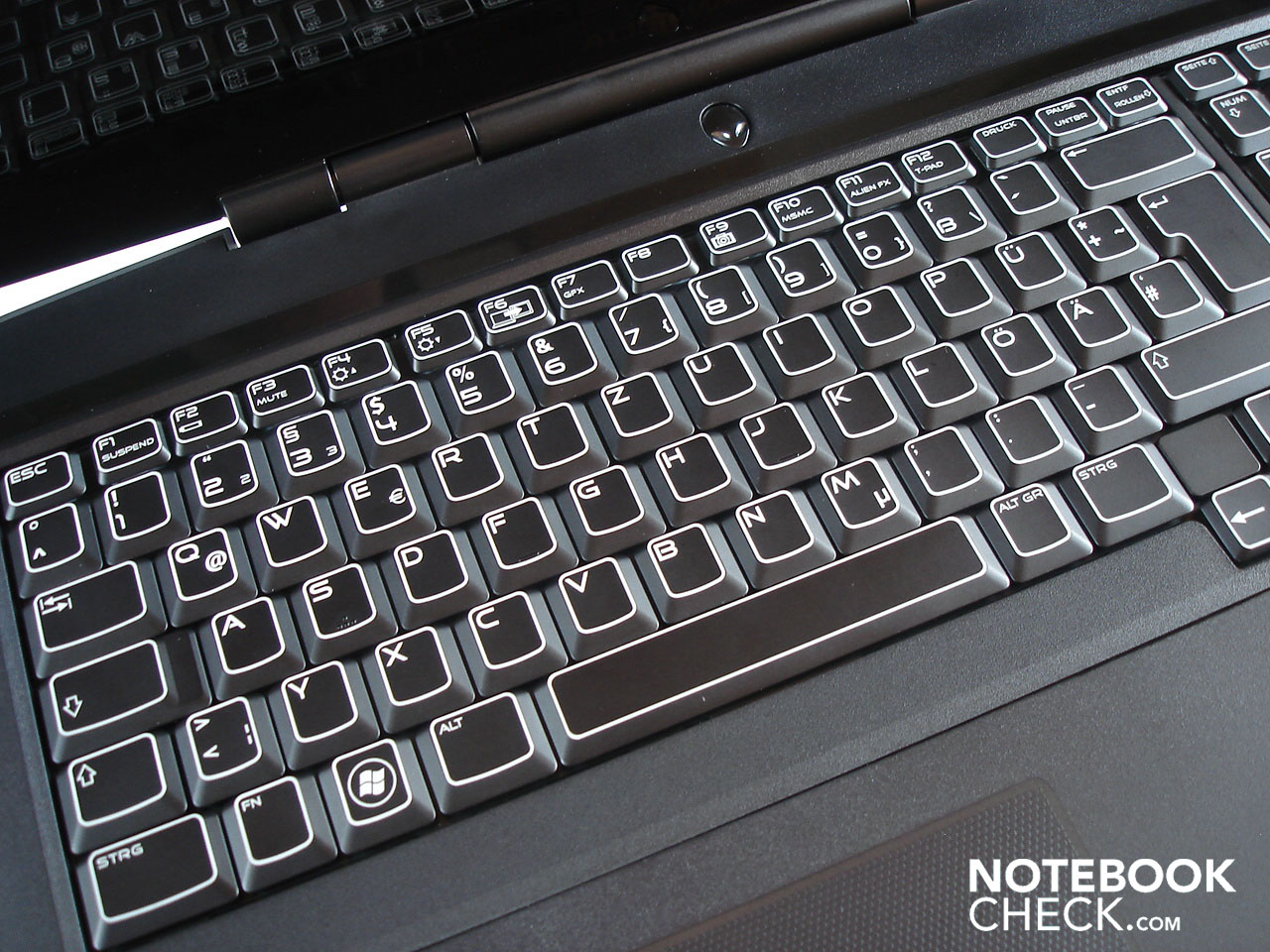 El teclado incorporado, que se halla junto a un bloque numérico separado, tiene unas agradables teclas de flecha grandes y logra convencer tanto en punto de presión como en tiempo de desplazamiento. Desafortunadamente, el teclado se flexiona en el área del bloque numérico y la tecla enter, al igual que las teclas de fleche ceden notablemente bajo una presión ligera. El sonido de las teclas adicionalmente prueba ser bastante ruidoso y por lo tanto no resulta ser de alta clase. Pero sin embargo, puede acostumbrarse rápidamente, debido a una excelente presentación. Y los dispositivos de entrada del M17x son hallados rápidamente incluso en las habitaciones más oscuras debido a su iluminación.