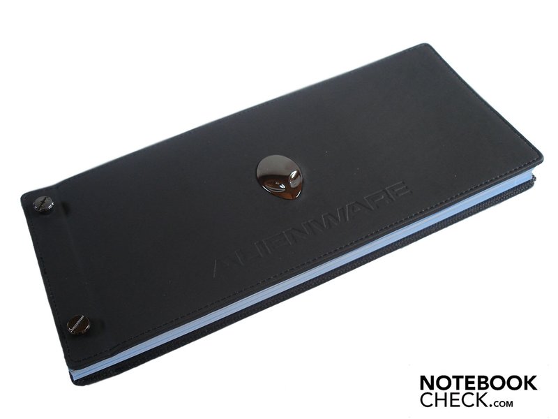 Cuando abre la caja de accesorios del M17x, seguramente quedará asombrado. Además de la capa negra de la base, también hallamos un mouse pad de clase alta (ambos con el típico logo Alienware) que deberían satisfacer incluso, las altas expectativas de jugadores. Además de esto, el grueso manual con encuadernación en cuero proporcionará miradas de deleite. Finalmente, el portátil está cubierto por una bolsa muy suave de color negro, que camufla al M17x de miradas muy curiosas. A propósito, la bolsa no es muy apta para transporte seguro porque no es acolchada.