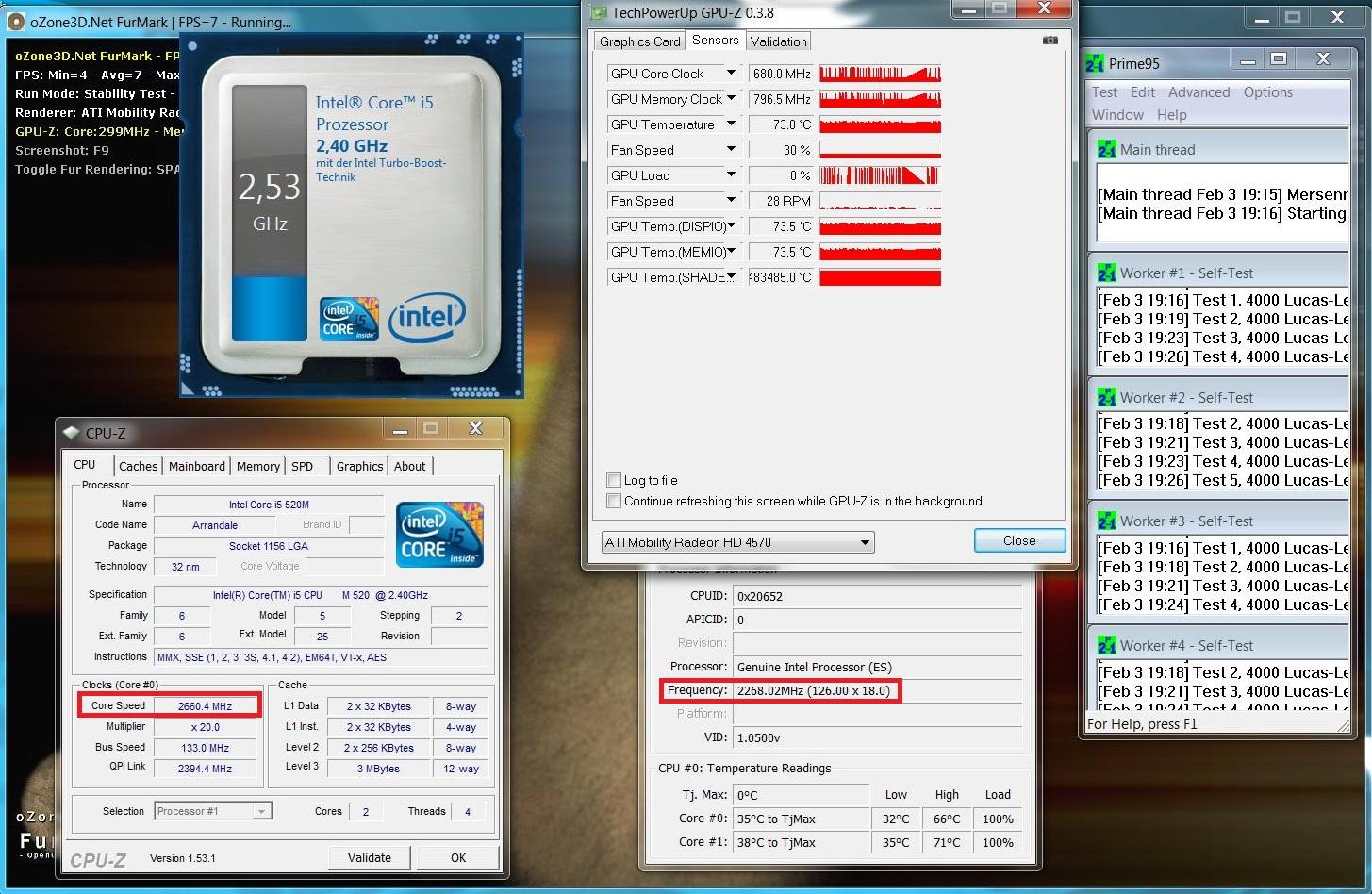 Generalmente la frecuencia del Core i5-520M es de 2,40 GHz. Con una tecnología bien alienada, llamada Turbo Boost, el CPU teóricamente aumenta su frecuencia (precondición de enfriamiento suficiente) en 133 MHz y alcanza exuberantes 2,93 GHz. Para comprobar el 1558 apropiadamente colocamos el CPU bajo carga de manera completa con la herramienta, Prime. Resultado: El CPU tuvo una frecuencia en un periodo aun más largo con aproximadamente 2,53 GHz (Herramienta Intel Turbo Boost Monitor).