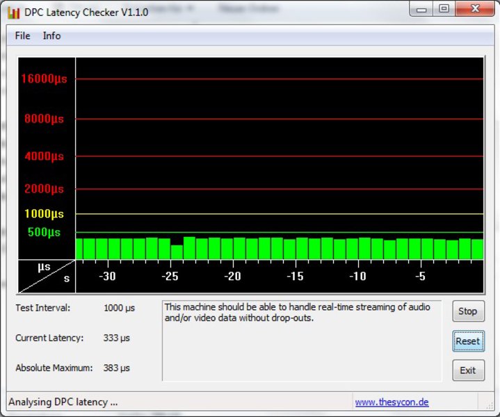 Probamos las latencias que podrían surgir, utilizando la herramienta DPC Latency Checker. Las latencias altas pueden llevar a problemas con sincronización cuando dispositivos externos son conectados. Incluso con la primera ejecución del Vostro V13, obtuvimos una figura clara con muy pocos problemas. Sólo hubo una barra roja que llegó casi hasta el techo, como dicen. Corregimos la imagen, seguimos nuestra primera sospecha, de exponer el módulo W-LAN como el culpable. Luego de apagar el W-LAN vimos muy pocas ondulaciones, las mismas que se hallaban en el área verde. De este modo, no deberían existir más problemas.