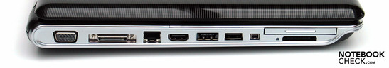 Los puertos ofrecidos son casi idénticos a los del HDX16. El lector de tarjetas, por ejemplo, fue posicionado de forma diferente, ahora se encuentra en el lado izquierdo, abajo del compartimiento ExpressCard. En el lado derecho, el drive óptico fue movido completamente al frente, lo que empuja el puerto USB (localizado aquí en el HDX16) al área posterior.