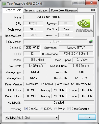 Como en el nuevo T510 y modelos T410, el modelo de prueba T410s ahora también posee una NVIDIA Quadro NVS 3100M con una memoria gráfica disponible de 512 MB para la salida de video. Es una tarjeta de video de nivel básico optimizada para aplicaciones empresariales. Esto significa que se ha dado prioridad a la estabilidad del controlador y a la compatibilidad y no tanto al aumento de rendimiento.