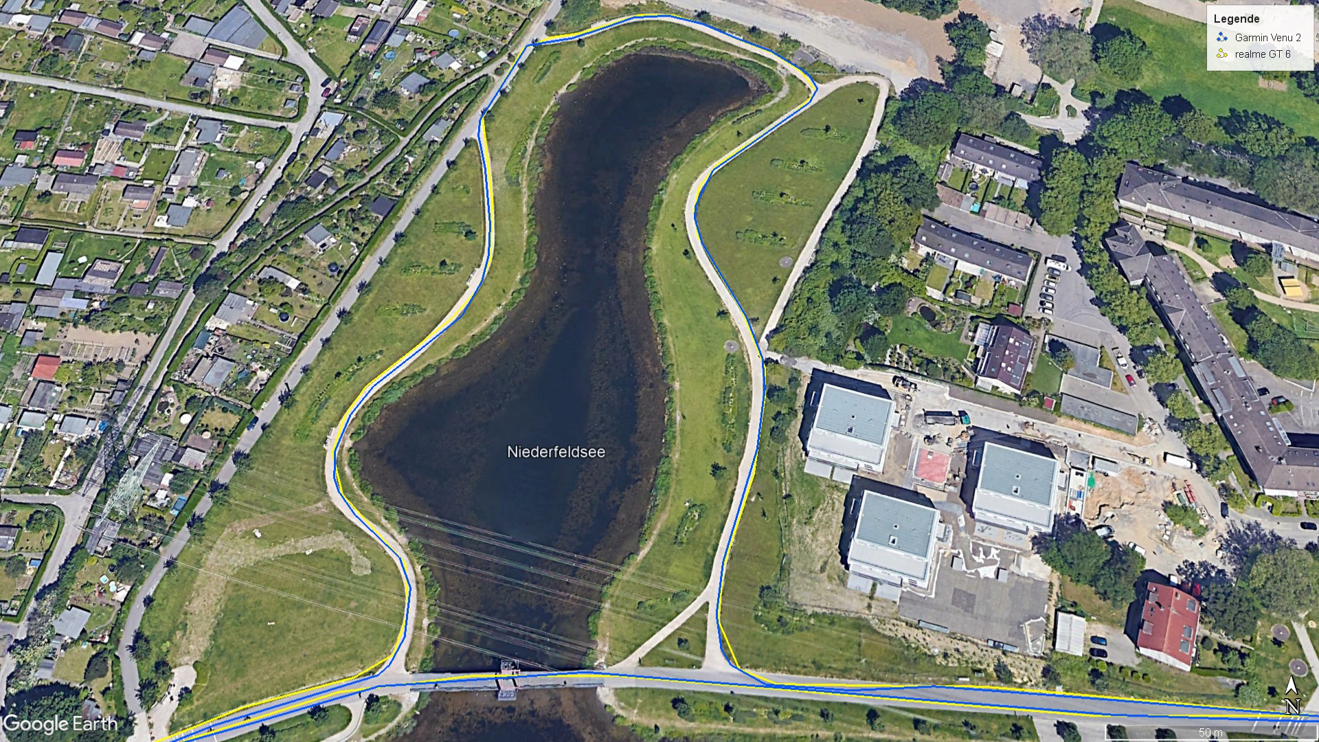 Para evaluar la precisión del seguimiento en la práctica, llevamos nuestro smartphone de prueba a dar un corto paseo en bicicleta y registramos la ruta con un Garmin Venu 2 a efectos comparativos. Nos gustó mucho la capacidad de seguimiento del Realme GT6, sobre todo teniendo en cuenta su precio. Las desviaciones de las rutas seleccionadas apenas son reconocibles en la vista detallada de la grabación GNSS. Sólo en unos pocos lugares el móvil Realme se desvía de la ruta que realmente utilizamos.