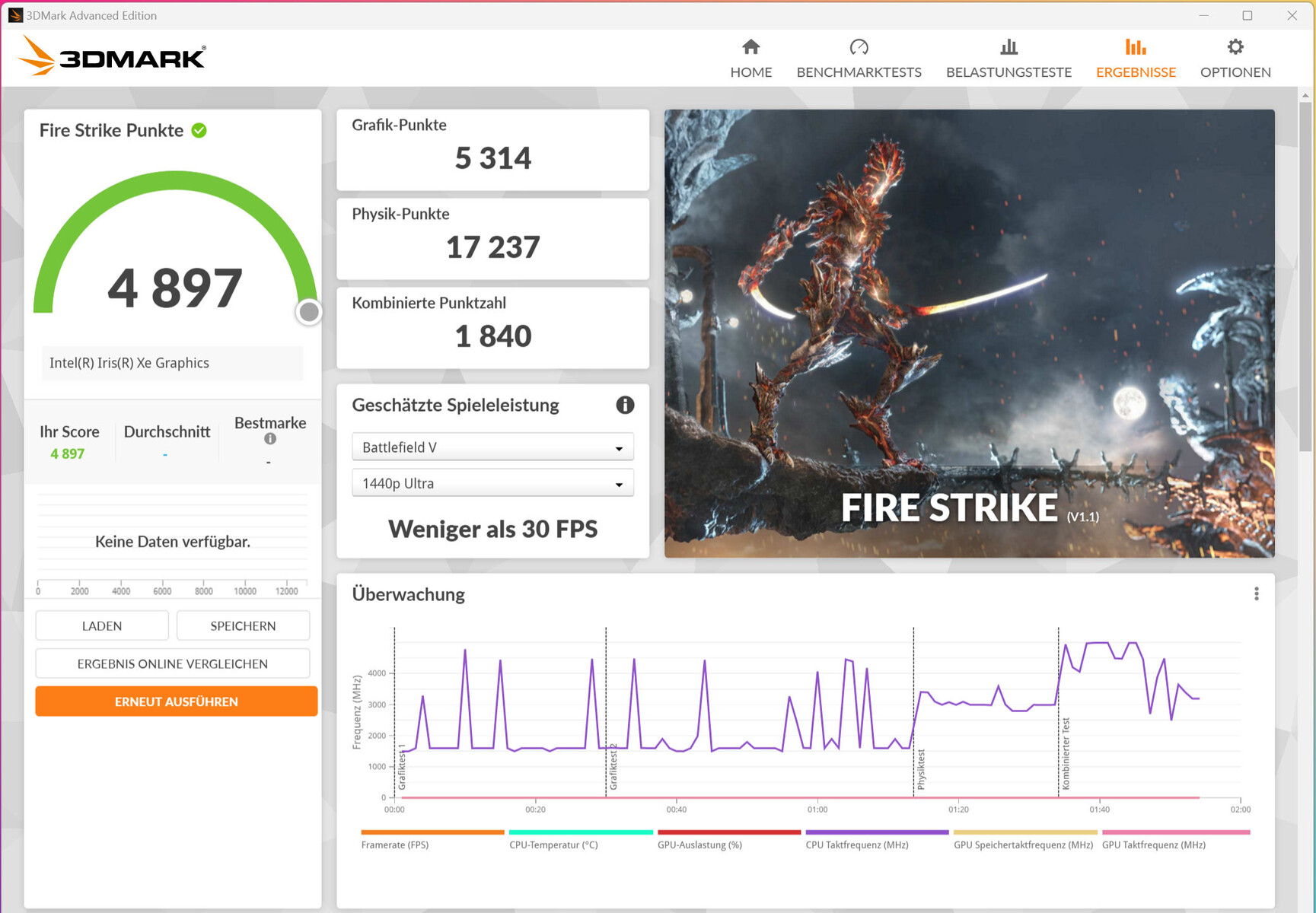 La prueba de estrés (Prime95 y Furmark en funcionamiento continuo) representa un escenario extremo para comprobar la estabilidad del sistema a plena carga. Justo al principio de la prueba, la CPU cae por debajo del reloj base a 1,6 GHz (núcleos P y E), y la GPU funciona a 900 o 1.000 MHz. Estas frecuencias siguen bajando a medida que avanza la prueba.