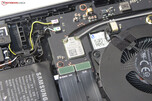 Para desmontar la cubierta inferior es necesario retirar todos los tornillos que están ocultos bajo las cuatro patas de goma (insertadas, no pegadas). Después, hay que tener cuidado al retirar la cubierta inferior, que está muy apretada y puede dañarse. Recomendamos utilizar una espátula plana. Después, se puede acceder al SSD (PCIe 4, M.2-2280), la segunda ranura SSD, los ventiladores, los altavoces y la batería.
