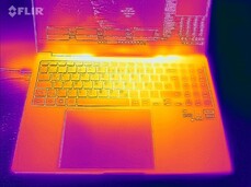 Las temperaturas de la carcasa se mantienen dentro de la zona verde en el uso diario (oficina, internet). Bajo carga (test de estrés, Witcher 3 test), el portátil se calienta notablemente, pero no en exceso. Las temperaturas de la CPU no son motivo de preocupación.