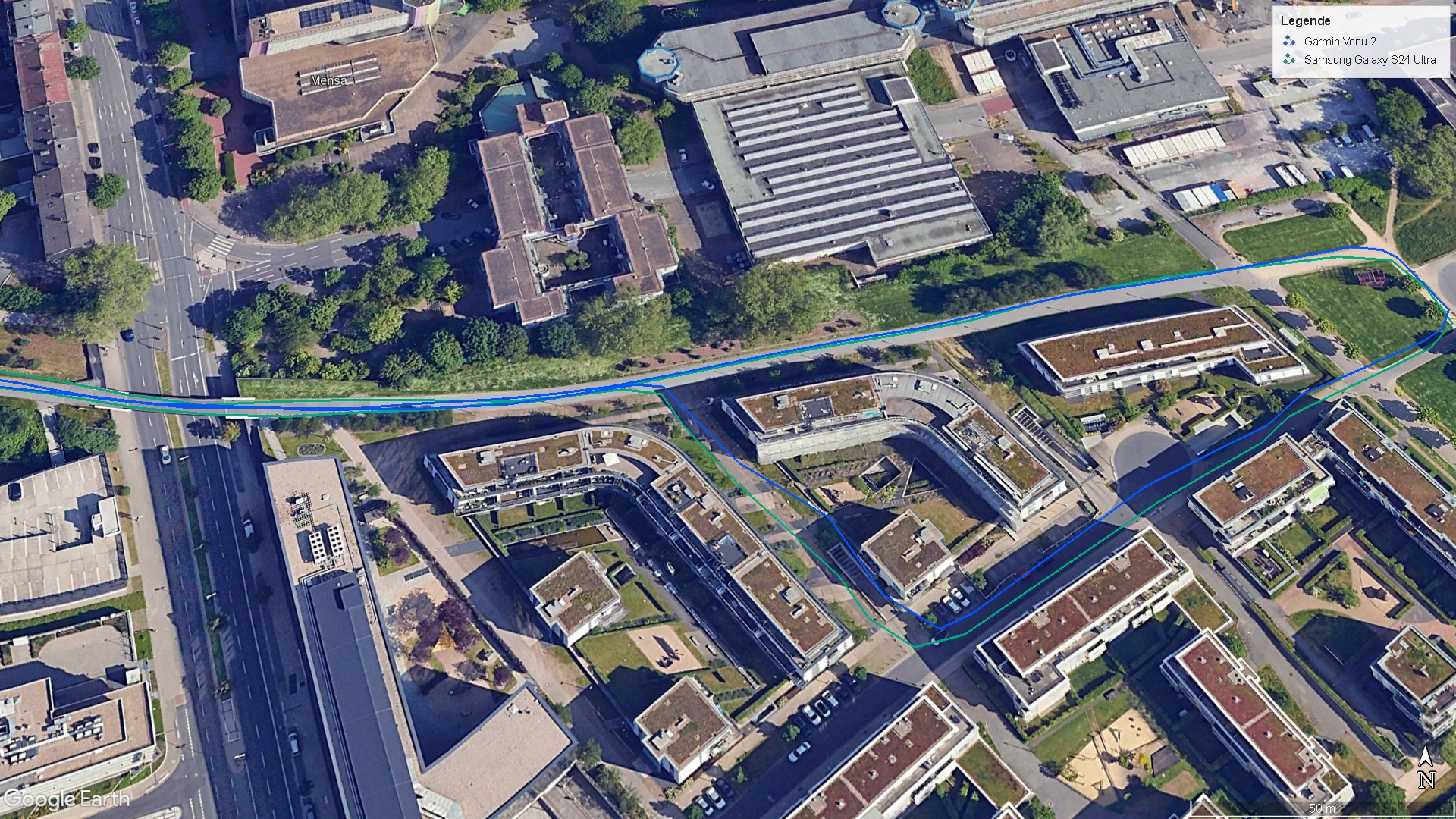 En un paseo en bicicleta, comparamos las capacidades de seguimiento del S24 con las del Garmin Venu 2. Ninguno de los dos dispositivos ofrece resultados impecables, pero el Galaxy S24 Ultra es un poco más preciso entre las casas, mientras que el smartwatch de fitness funciona ligeramente mejor alrededor del lago. En cualquier caso, el smartphone de Samsung está perfectamente equipado para todas las tareas de navegación.