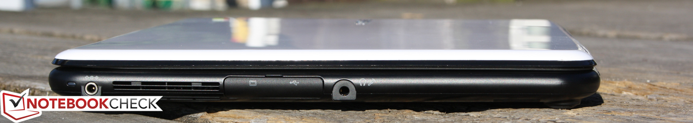 La ranura de la SIM, el mini VGA y el USB están distribuidos elegantemente tras una cubierta de goma. Esto quiere decir que no pueden perderse ya que están firmemente agarrados al chasis. Pero casi no vimos el Lector de tarjetas del lado inferior del frontal del Chromebook. Una pequeña tarjeta de plástico ocupa el lugar de las tarjetas de memoria de las cámaras digitales.