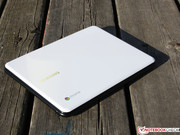 El Chromebook está hecho para tener la apariencia de un dispositivo de trabajo estiloso y minimalista. Las superficies del descanso de las manos son agradablemente romos, aunque atraen las huellas. Lo mismo puede decirse de la tapa blanca y brullante con el logo de Chrome. El brillante lecho negro de las teclas así como el marco del TFT le dan un toque de elegancia sin producir superficies espejo exageradas. El panel en sí mismo es mate.