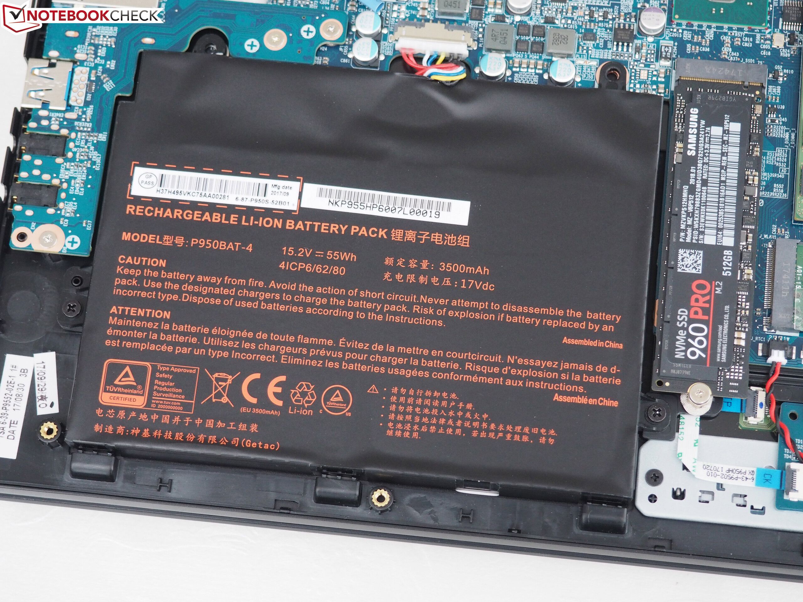 El funcionamiento interno recuerda fuertemente al hermano Barebone P950HP6, que probamos en forma de Guru Fire KS. El sistema de enfriamiento consta de dos ventiladores para la GPU y un ventilador para la CPU. Además, hay dos ranuras de RAM, una ranura M.2 con soporte NVMe / PCIe y una ranura de 2.5 pulgadas que solo puede adaptarse a unidades de disco duro con un grosor máximo de 7 mm (~ 0.28 in). Como es habitual hoy en día, la batería está atornillada en la carcasa.