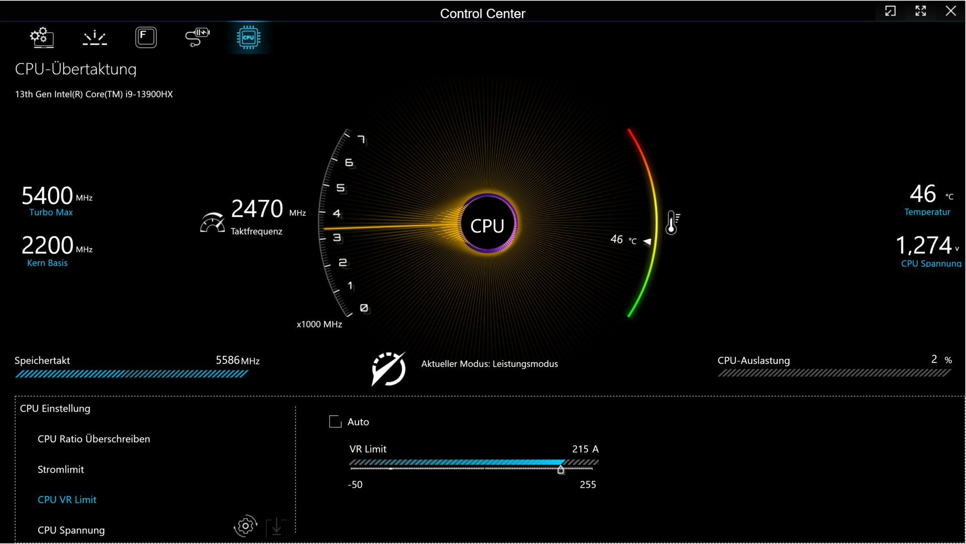 el "Modo Rendimiento" permite a los usuarios overclockear la GPU y la VRAM en el Centro de Control. Al hacer clic en las dos flechas hacia abajo se abrirá el menú correspondiente (figura 3). Tendrás que activar el overclocking de la CPU en la BIOS para que aparezca una nueva pestaña en el Centro de Control (ver figuras 12 a 16). Pero cuidado: overclockea el hardware bajo tu propia responsabilidad - eres responsable de cualquier daño derivado de ello.