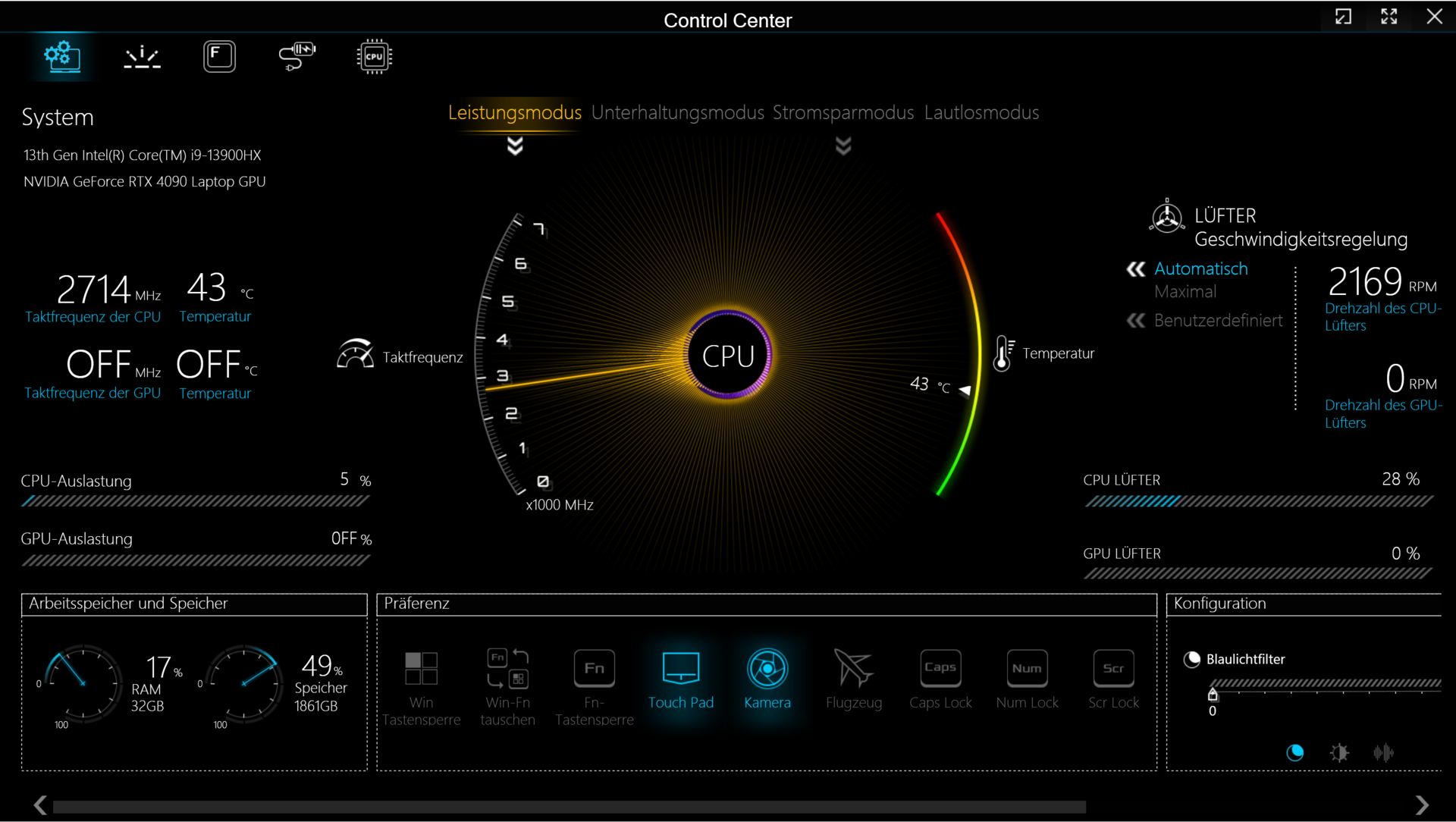 El Key 17 Pro ofrece cuatro modos de energía especificados por el fabricante (ver tabla). Puedes cambiar entre ellos usando el software Control Center instalado en el portátil. Ejecutamos nuestras pruebas en "Modo Rendimiento" y nuestro test de duración de batería en "Modo Ahorro de Energía" (con la RTX 4090 desactivada. Optimus estaba activado durante nuestras pruebas.