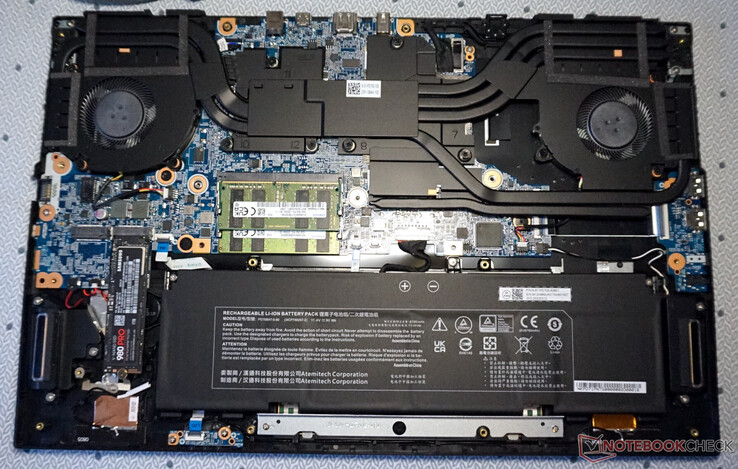 De este modo se puede acceder al doble ventilador. La batería también puede ser reemplazada fácilmente. Esto se aplica aún más a la RAM y a los SSDs M.2. Hay dos interfaces disponibles aquí, que se ocupan en el momento de la compra, o también pueden actualizarse más tarde.