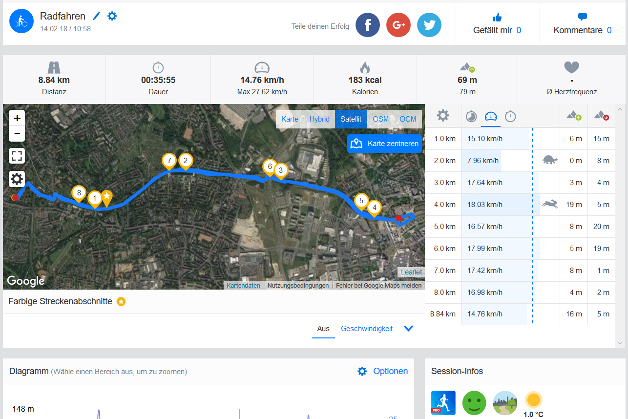 En el interior, el dispositivo no tenía conectividad GPS en absoluto, ni siquiera cuando estaba parado en la ventana. Afuera, la recepción del GPS y la precisión (6 m) eran decentes. Determinamos la precisión del GPS al tomar cada teléfono inteligente en un recorrido en bicicleta durante el cual se enfrenta a una unidad de GPS Garmin Edge 500 profesional. En general, el ZenFone 4 Max lo hizo bastante bien con solo pequeñas desviaciones y desviaciones de la pista real aquí y allá. Por lo tanto, el GPS es más que suficiente para un uso ocasional.