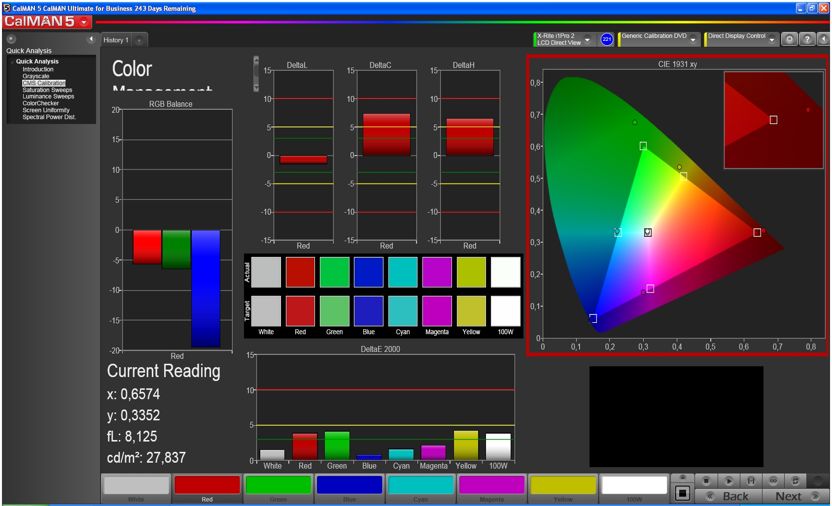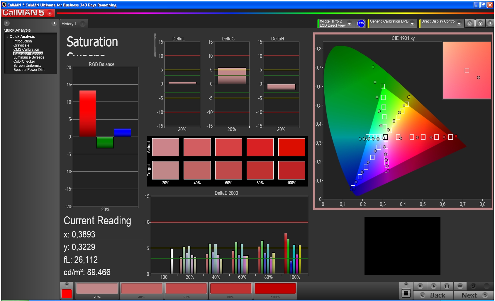 Vamos a examinar la pantalla en los cuatro modos usando el software CalMAN software y un colorímetro. Las capturas resultantes se encuentran debajo.