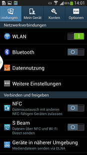 El menú de configuración revela mas tecnologías de comunicación integradas en el Galaxy S4: NFC puede usarse para intercambiar datos con dispositivos cercanos, Screen Mirroring ayuda a enviar imágenes y vídeos a otras pantallas dentro de la misma red, DLNA permite la comunicación con una serie de gadgets. Además, el S4 soporta Wi-Fi Direct y, por supuesto, también Bluetooth 4.0. Tethering, convertir el teléfono en un punto de acceso inalámbrico a la web, es posible usando el cable USB, Bluetooth y Wi-Fi. Todas las opciones de conexión que pudimos probar funcionaron impecablemente, aunque puede ser difícil en ocasiones descubrir qué tecnología está siendo usada en cada momento para transferir una foto. Por ejemplo, enviamos accidentalmente una foto a un Smart TV en vez de a otro smartphone. Genial: usando un cable especial, el smartphone se puede conectar via USB a dispositivos con HDMI.