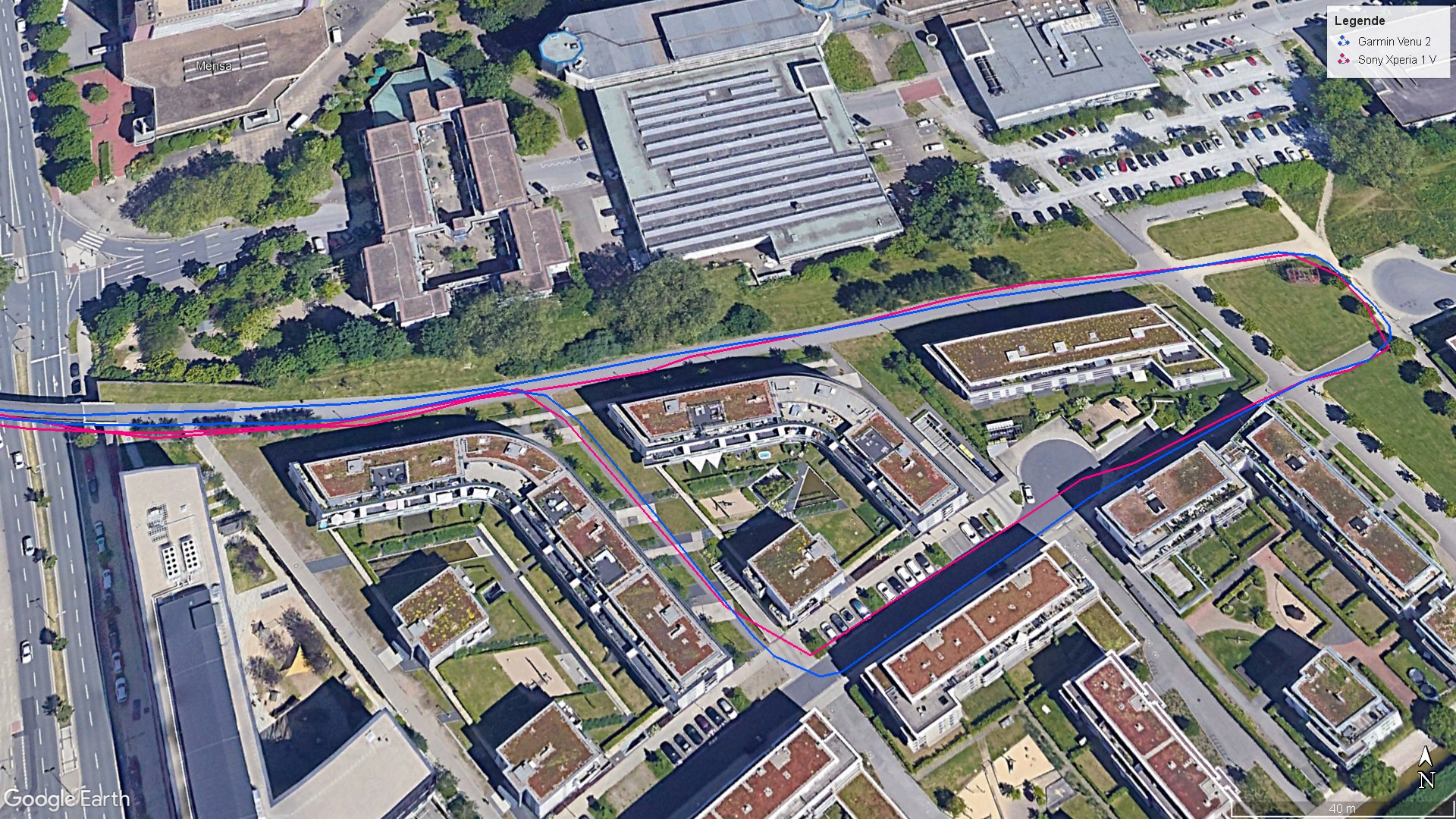 Para localizar su posición, el smartphone de Sony utiliza los principales sistemas de satélite sólo en la banda única. En nuestra prueba, es compatible con Beidou (B1), GPS (L1), Galileo (E1) yGLONASS (G1), y por desgracia aquí no hay avances respecto a su predecesor. Aunque la precisión de localización del Xperia 1 V no es perfecta, la ruta registrada se corresponde en su mayor parte con la del Garmin Venu 2, que utilizamos para comparar.