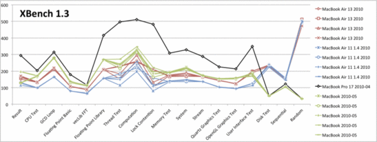Con la excepción del la prueba del disco, el modelo de 13 pulgadas se desempeña claramente mejor que el MacBook Air de 11 pulgadas. El más veloz MacBook puede alejarse por casi la misma cantidad en la pruebas de CPU, como el modelo de 13 pulgadas puede ser comparado con el modelo de 11 pulgadas. El MacBook Pro de 17" con un procesador Core i7 está en otra liga, aunque sea ligeramente subyugado en las últimas pruebas debido al Disco Duro estándar.
