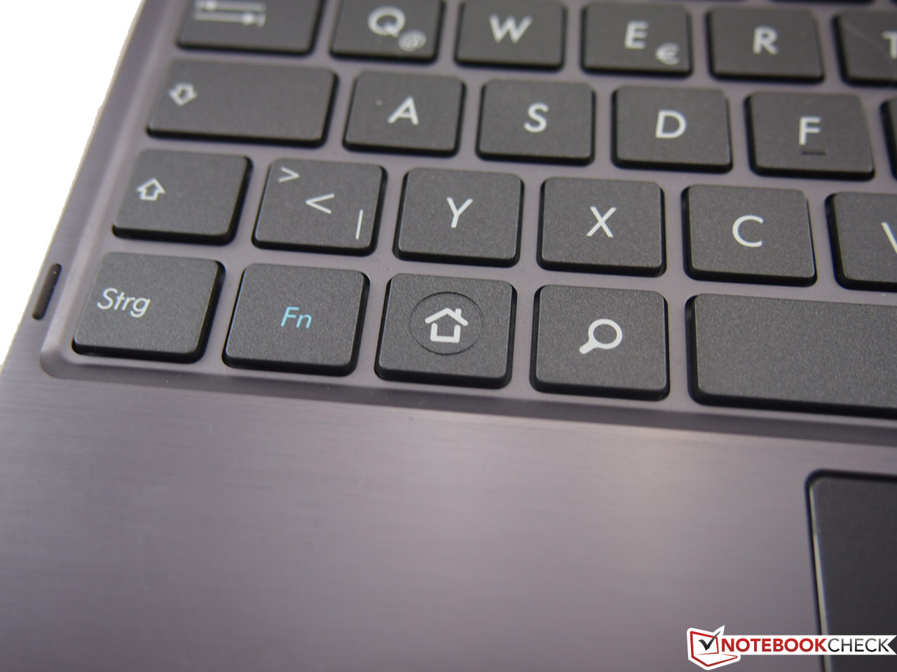 Dado que no es un teclado con distribución Windows, tiene una tecla Home en vez de una tecla Windows. Devuelve al usuario a la pantalla inicial en toda situación. Lo que es mas, tiene dos teclas para cambio de FN - un hueco podría haberse creado de otro modo. Sin embargo, sólo las cuatro teclas de cursor están asignadas con funciones cambiables. Las funciones de las teclas F1 a F12 que a menudo se disparan a través de la tecla FN en portátiles están directamente accesibles: Aparte de las teclas multimedia hay, entre otras, controles para el brillo de la pantalla, activar/desactivar la WLAN, Bluetooth y touchpad, así como teclas para el navegador y la configuración de sistema.