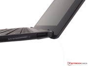 Aunque era igual de estable, el precursor venía en una carcasa de plástico. La carcasa cede de un modo menor (e insignificante) bajo presión, pero ello no se observa en el nuevo modelo de aluminio: Tablet y teclado no muestran signos de abolladura o torsión bajo impacto. Y eso es a pesar de que sendos componentes son unos pocos milímetros mas delgados que los del Transformer TF101: El tablet predecesor tiene un grosor de 13 mm según el fabricante - el Transformer Prime lo tiene de sólo 8.3 mm según la hoja de especificaciones. Esto es una diferencia muy sensible. Lo pusimos a prueba y medimos 8.8 mm con un calibre de precisión. Esto se corresponde exactamente con el punto mas grueso del iPad 2. Aquellos que ahora dicen que esto es una distinción sin diferencia, podrían tener razón. No debería haber mucha diferencia entre el iPad 2 y el Transformer Prime - pero la hay entre sendos modelos Transformer.