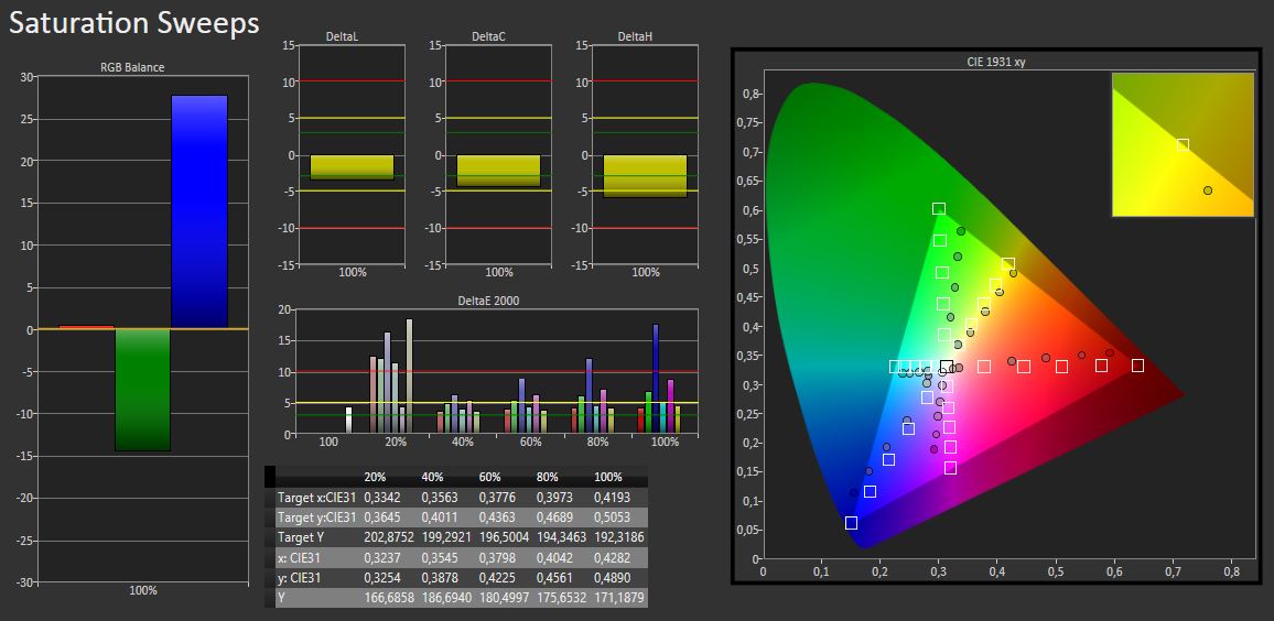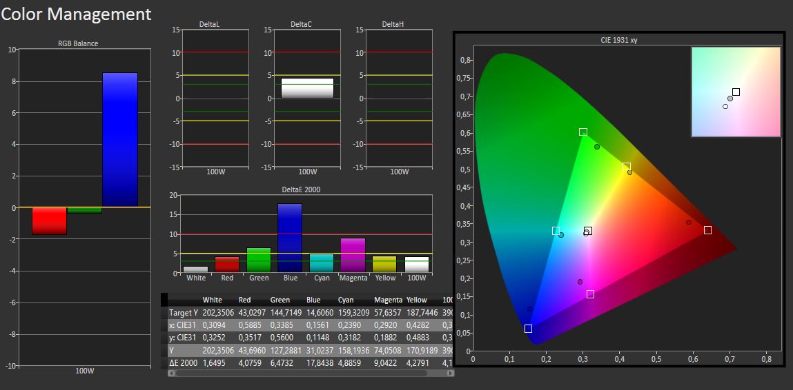 Medimos un ratio de contraste de 1178:1 con el software CalMAN. También pudimos confirmarlo subjetivamente, ya que los colores se ven vibrantes y frescos. Dónde hay un fondo blanco notamos una decoloración gris en el borde inferior, si bien sólo se nota si el fondo es completamente blanco. No pudimos realizar una calibración con medición de espacio de color debido a problemas e incomaptibilidades de driver entre los dispositivos de medición y PowerVR.