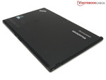 El Thinkpad Table 2 se parece mucho a sus parientes portátiles, pero es mucho mas delgado con una altura de sólo 10mm. Además, el tablet sólo pesa 538 gramos. En comparación con el tablet de primera generación de ThinkPad es mas pequeño y unos 200 gramos mas ligero ahora. La elección de materiales y el color siguen siendo los mismos. La parte trasera es de plástico negro ligeramente engomado para que ofrezca el agarre necesario. El frontal consiste en vidrio Dragontrail-Glass a prueba de arañazos de la compañía AGC (Asahi Glass Corporation). Una pequeña tira a la izquierda no quedó cubierta con cristal, en su lugar está ligeramente engomada como la trasera para ofrecer mejor agarre. El dispositivo está afilado, sólo es un poco curvado en el lado izquierdo para poder agarrarlo cómodamente. El tablet no ofrece acceso a la batería o a otros componentes hardware debido a la falta de una cubierta de mantenimiento.