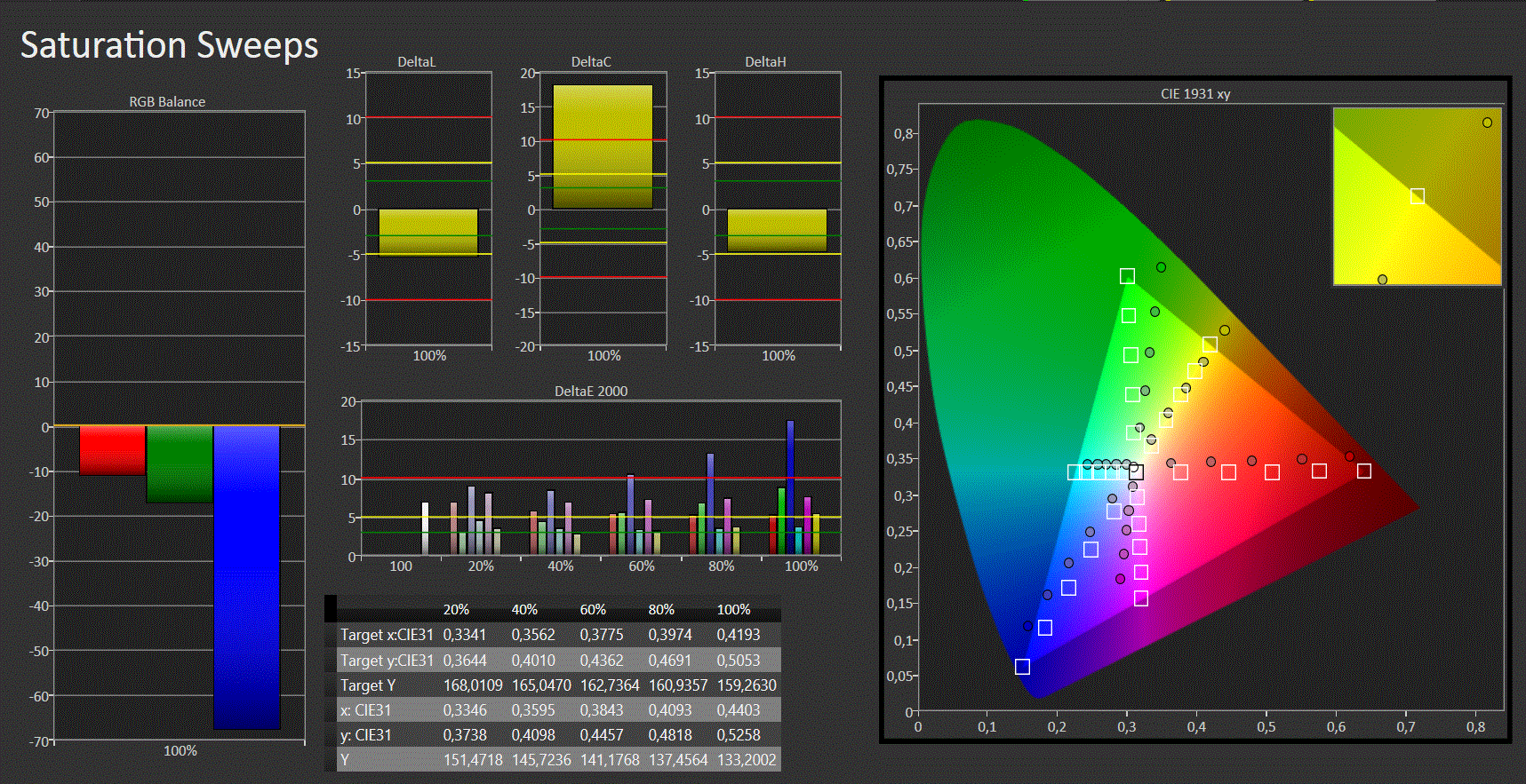 Según el brillo, el valor gamma alcanza de 1.7 a 10% de brillo y el valor objetivo de 2.2 a un brillo máximo. Las temperatura de color también fluctúa ligeramente entre los 6.900 y 6.800 Kelvin según el brillo, lo que queda por encima del ideal de los 6.500 Kelvin. Aunque el punto blanco está exactamente dónde debería según el diagrama de color CIE 1931, todos los otros colores salvo el cian (rojo y amarillo están cerca) quedan muy lejos de los valores ideales.
