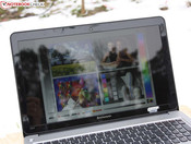 La superficie reflectiva y el bajo brillo, de media 189 cd/m², hacen al U510 inadecuado para el uso en exteriores. El trabajo efectivo se ve dificultado por los reflejos y el escritorio demasiado oscuro. Las fotos siguientes se tomaron en un día nuboso. Incluso en estas condiciones ideales, el escritorio seguía mayormente demasiado oscuro. Para ser suficientemente legible a la luz del día, la luminancia de un panel reflectante debería ser de al menos 300 cd/m².