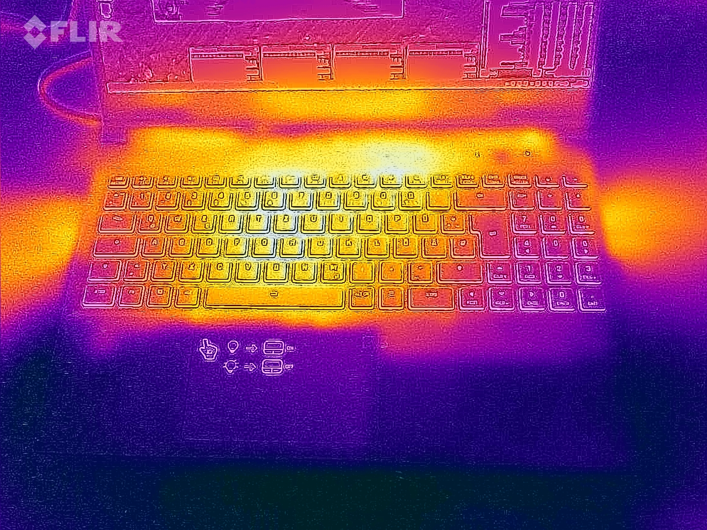 Una carga elevada (prueba de estrés, Witcher 3 test) hace que las temperaturas del portátil aumenten notablemente. Sin embargo, nunca alcanzan niveles críticos. En el uso cotidiano (oficina, Internet), las temperaturas de la carcasa se mantienen siempre en la zona verde.