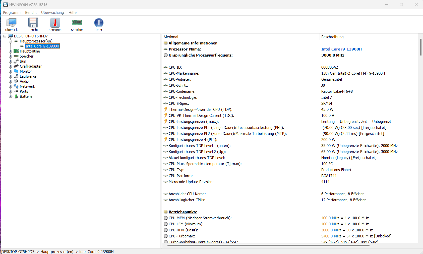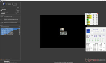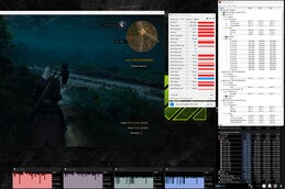 La prueba de estrés (Prime95 y Furmark en uso continuo) simula un escenario extremo para comprobar la estabilidad del sistema a plena carga. La CPU (P: 3,8 a 3,9 GHz, E: 2,7 GHz) comenzó la prueba con velocidades de reloj elevadas. En el transcurso posterior, estos valores se hundieron hasta situarse en torno al nivel de reloj base. La GPU funcionó casi a plena potencia.