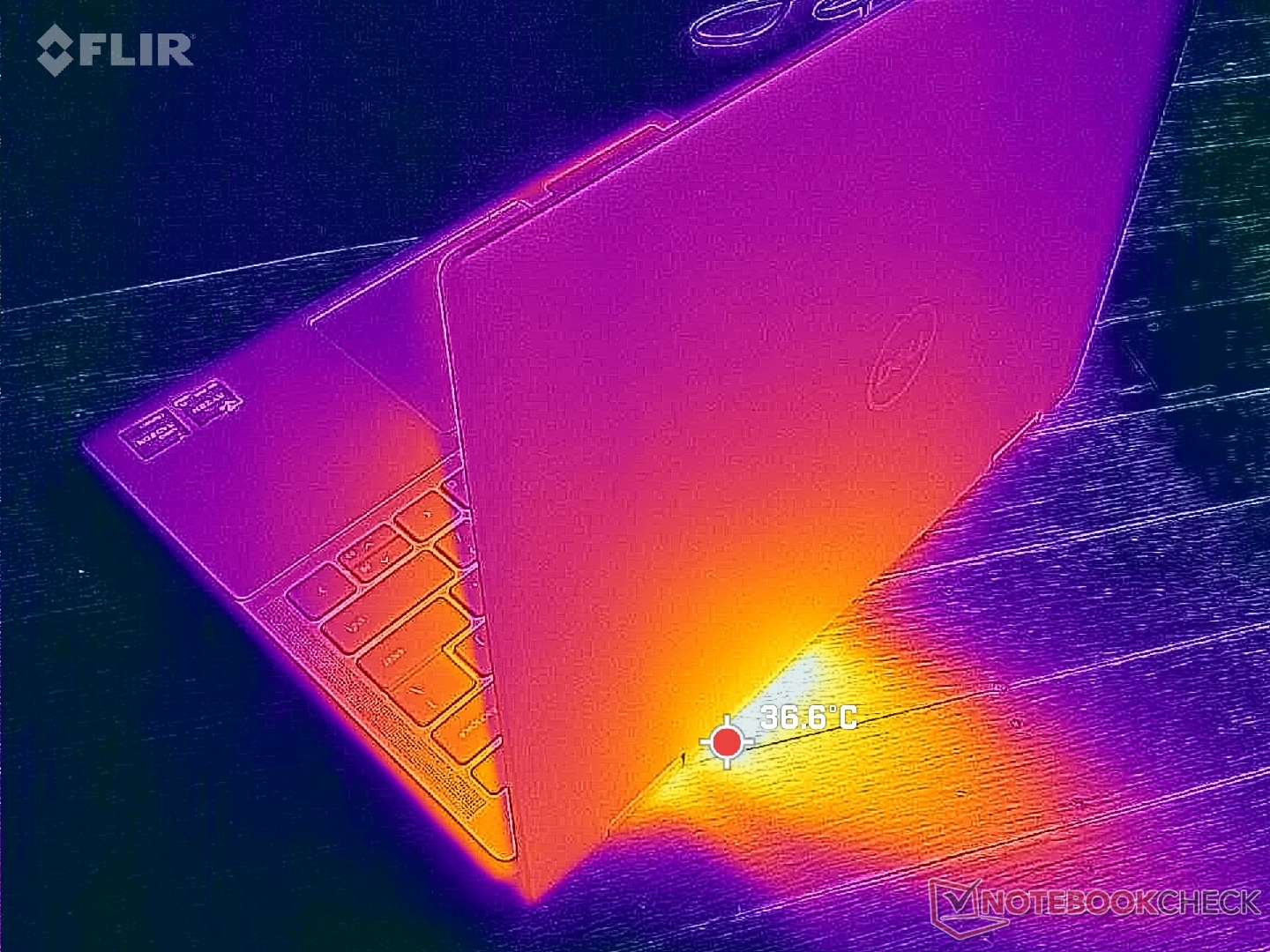 Las temperaturas superficiales son más frescas que las que registramos en el Inspiron 14 7620 2 en 1 del año pasado. Bajo carga, por ejemplo, los puntos calientes de la parte superior e inferior se acercarían a sólo 36 C y 39 C, respectivamente, comparados con los 46 C del modelo del año pasado. El alto rango de 30 C es comparable a modelos como el IdeaPad Flex 7i 14.