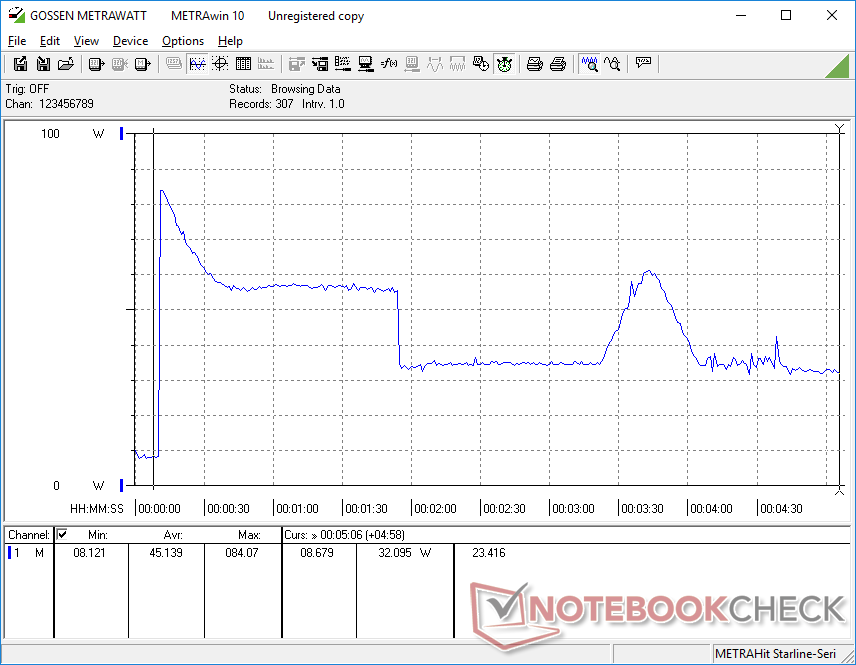 Registramos un consumo máximo de 87 W, mucho más que la mayoría de los otros portátiles con alimentación ULV. Este mayor consumo se debe al adaptador de CA de 90 W incluido, que es un valor muy alto para este tipo de procesador y sistema. El HP Spectre x360 14por ejemplo, viene con un adaptador de corriente de 65 W. La mayor capacidad de alimentación permite al procesador del Dell rendir más rápido que la media, incluso si los beneficios de Turbo Boost duran poco.