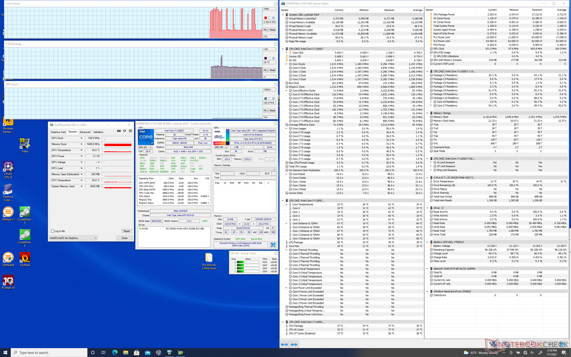 También se puede observar un comportamiento cíclico similar cuando se juega. Si se ejecuta Witcher 3por ejemplo, hace que las frecuencias de reloj de la GPU y las temperaturas se muevan en ciclos como se muestra en la tabla siguiente. Las velocidades de fotogramas también se mueven en ciclos, por lo que los usuarios pueden considerar la posibilidad de activar v-sync cuando juegan.