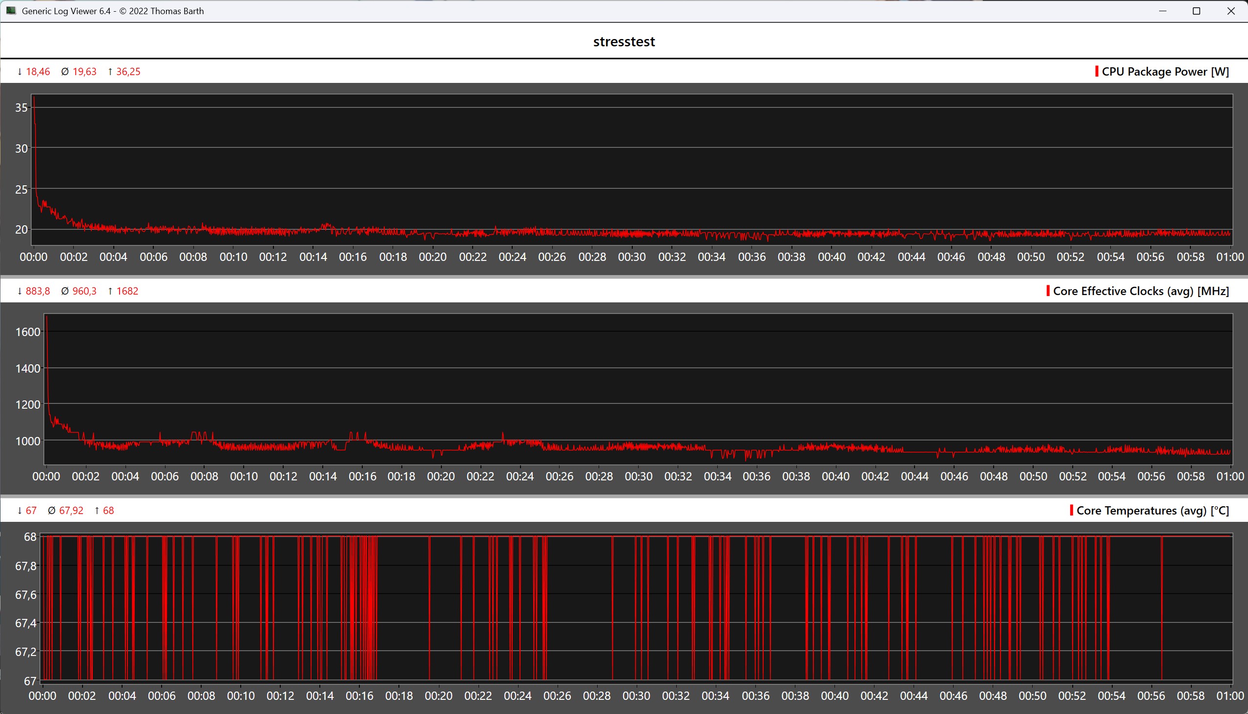 Las temperaturas superficiales de la iWork GT Ultra siguen siendo poco críticas en general. A plena carga, medimos un máximo de unos 46 °C en la parte trasera, lo que es perceptible pero no molesto en el uso cotidiano. En la prueba de estrés con carga combinada de CPU y GPU, el SoC alcanza brevemente un consumo de energía de unos 36 vatios antes de estabilizarse rápidamente en unos 19 vatios.