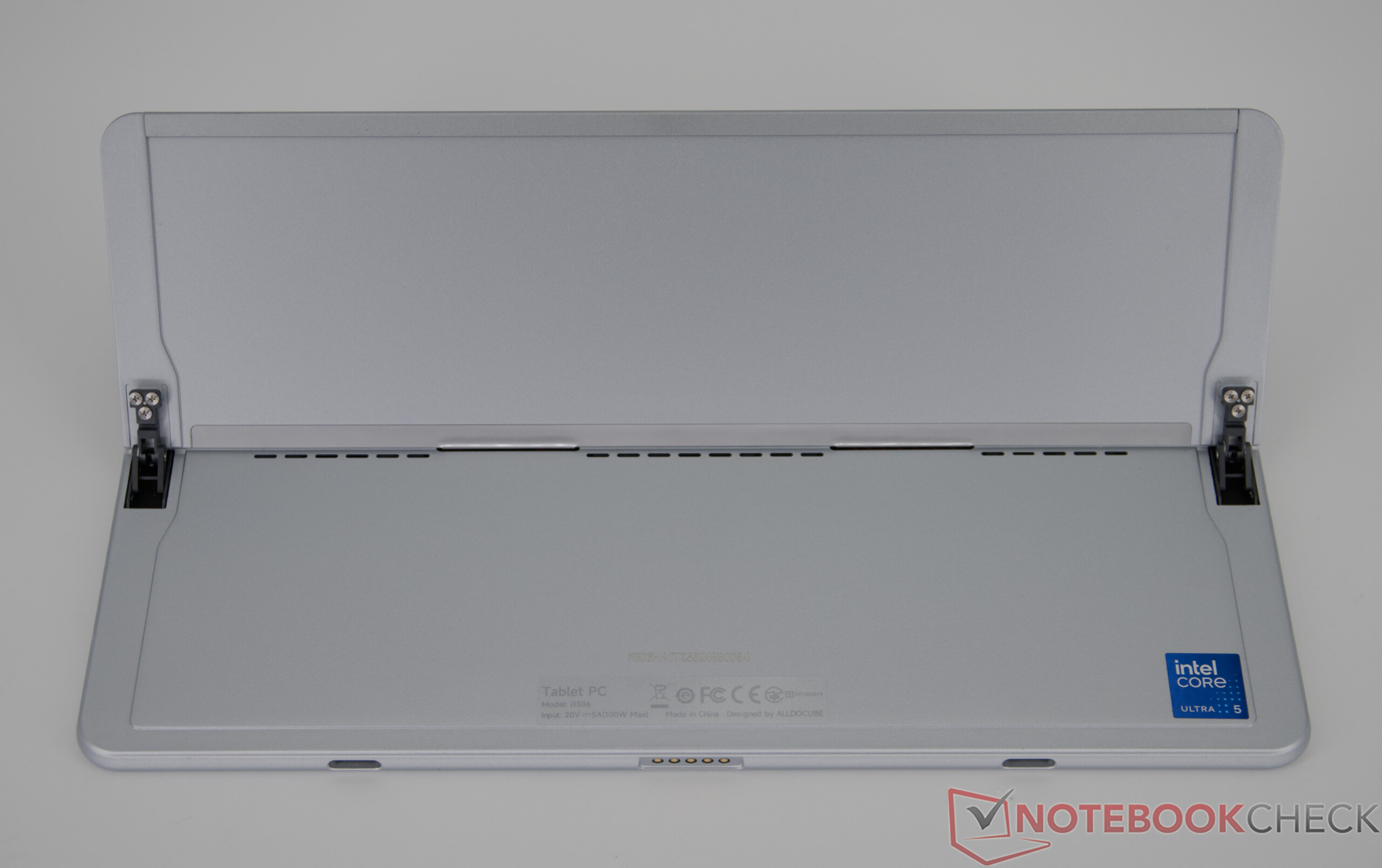 El iWork GT Ultra viene con un pie de apoyo integrado. Alldocube apuesta por una carcasa metálica que crea una impresión general de alta calidad. Sin embargo, bajo una fuerte presión, hay cierta flexibilidad: se notan ligeros crujidos al girar y una pantalla que cede ligeramente, pero no tienen un efecto negativo en el uso diario: todo permanece estable incluso con entradas táctiles normales. El soporte abatible de la parte trasera es estable y recuerda al de una tableta de Microsoft.