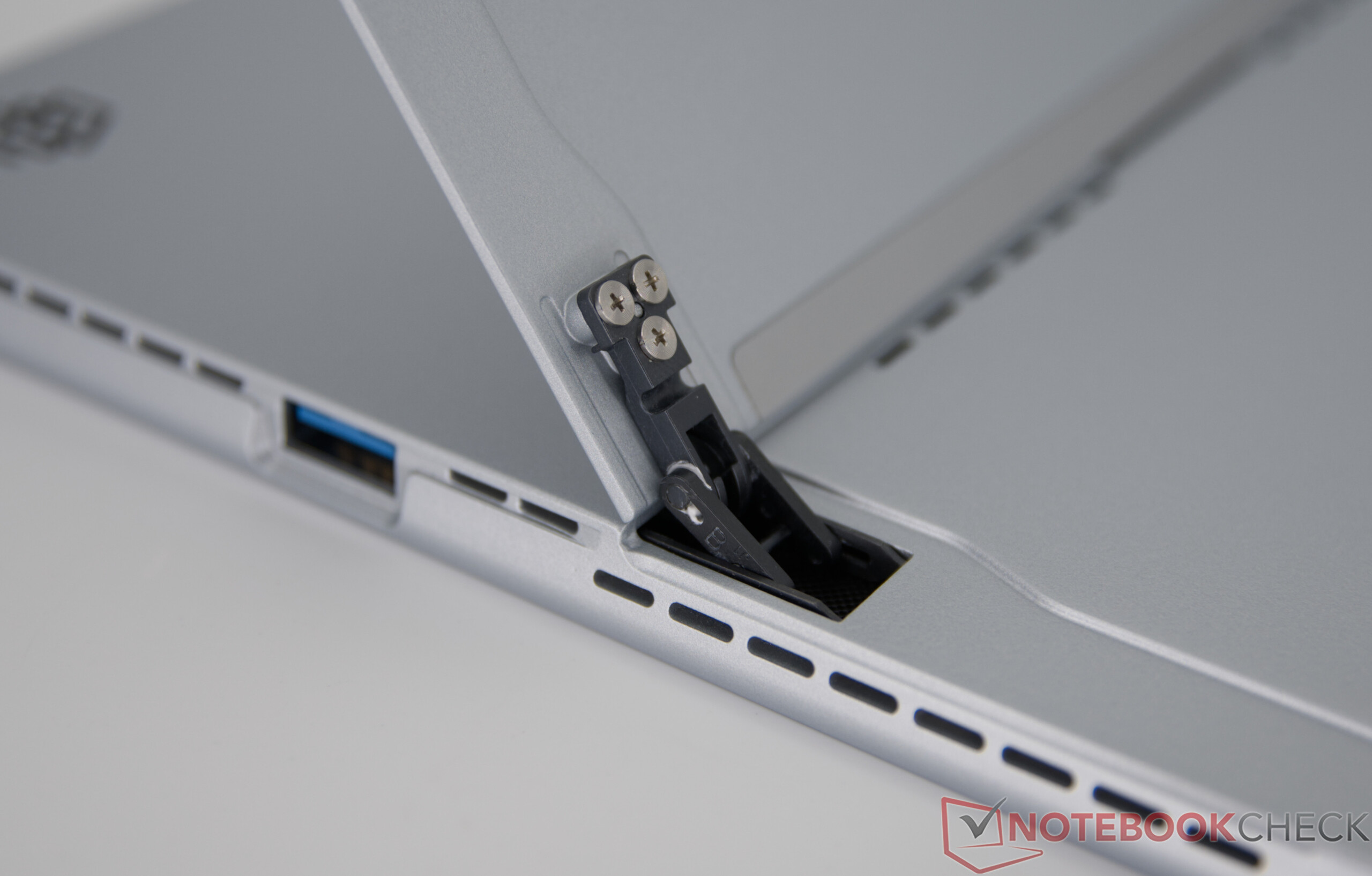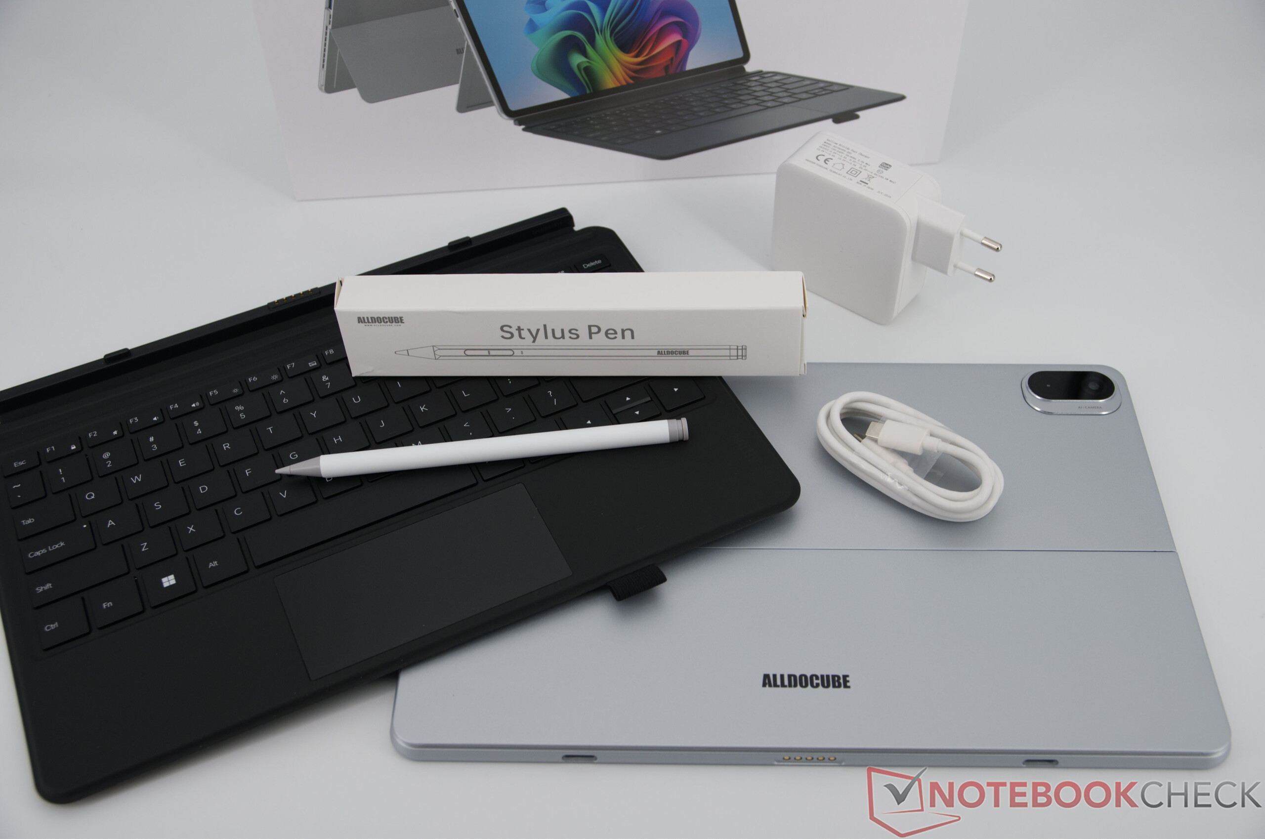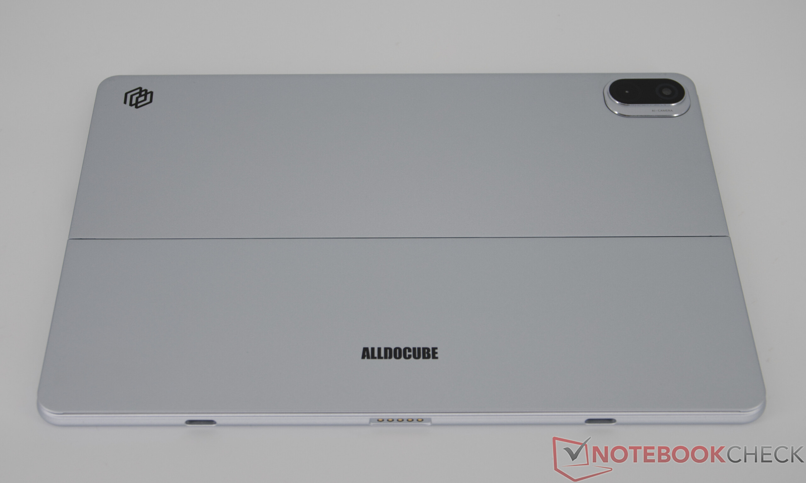 El volumen de suministro incluye una cubierta para el teclado que se fija magnéticamente a la parte inferior. La parte superior puede abatirse para servir de soporte, lo que funciona con fiabilidad en la práctica y ofrece además una protección adicional. La cubierta del teclado opcional se acopla a la parte inferior, pero no es especialmente segura y puede soltarse con relativa facilidad. La tableta en sí mide unos 10 mm de altura y pesa unos 870 gramos. Con el teclado, sin embargo, el peso aumenta significativamente, y la altura total también aumenta ligeramente. La fuente de alimentación incluida pesa 240 gramos.
