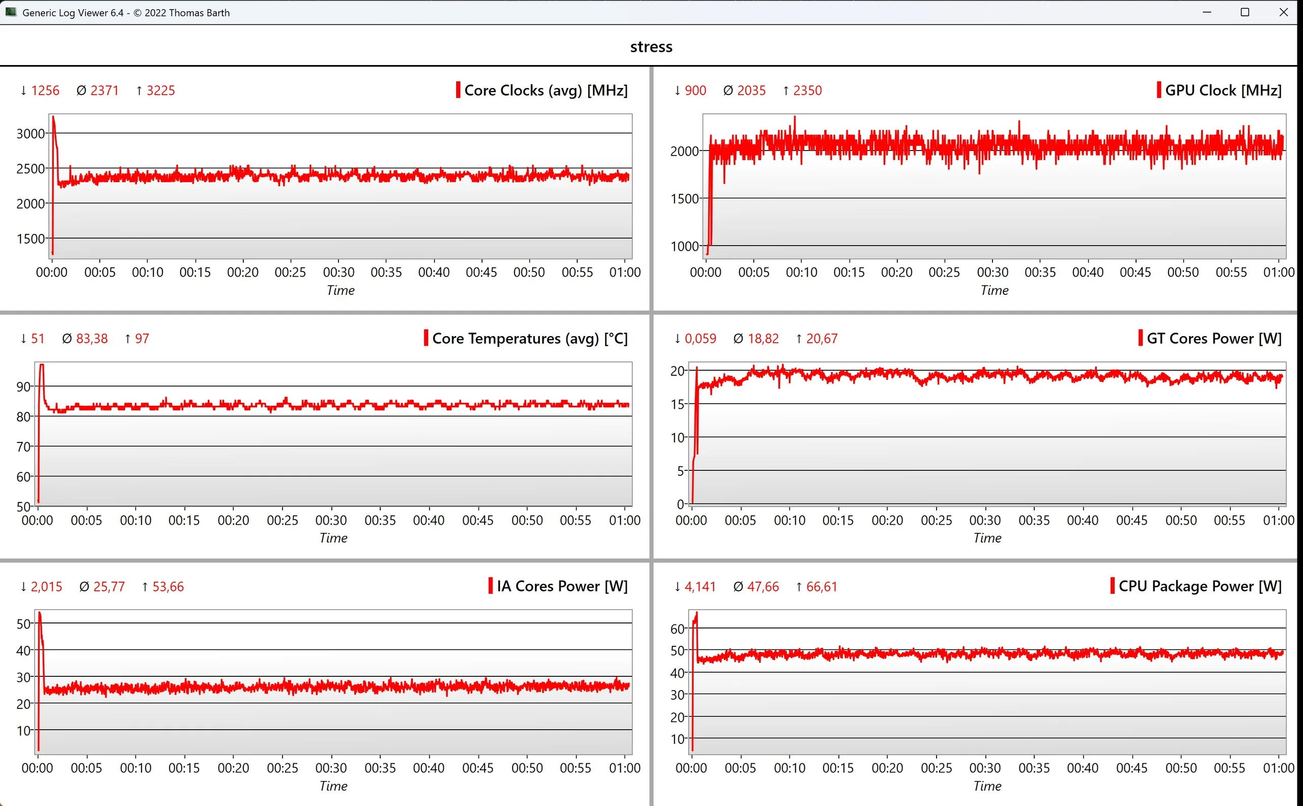 Bajo carga, podemos ver un máximo de 96 vatios, que luego se nivela rápidamente en 80 vatios después de unos 45 segundos. Fuera de la UE, el Zenbook Duo se entrega con una fuente de alimentación de 100 vatios, que parece suficientemente potente.