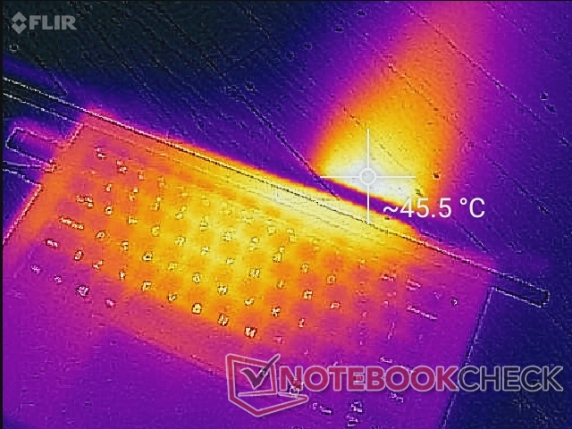 Las temperaturas superficiales son más frías que las que observamos en el Lenovo Yoga 9 14IAP7 de la competencia cuando se ejecutan cargas bajas, mientras que son más o menos las mismas entre ellos cuando se ejecutan cargas más exigentes. Los puntos calientes están más cerca del centro del teclado donde puede alcanzar los 40 C para ser comparable con el Gram 14T90N o el mencionado Lenovo.