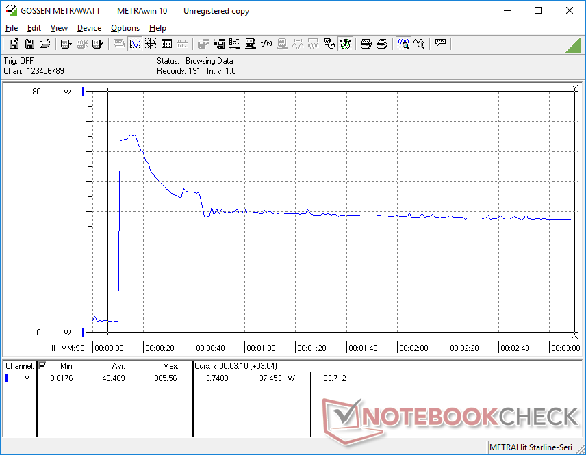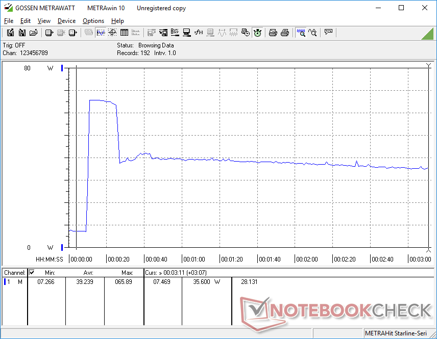 Pudimos registrar un consumo temporal máximo de 66 W del pequeño (~9.8 x 6 x 2.7 cm) adaptador USB-C AC de 65 W cuando la CPU está al 100% de uso.