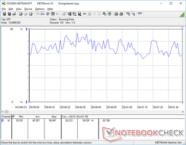 El sistema es muy eficiente en cuanto al consumo de energía, ya que sólo consume entre 2 y 7 W cuando está en reposo en el escritorio, dependiendo del perfil de energía y la configuración del brillo. La ejecución de cargas de nivel de juego exigirá alrededor de 45 W o aproximadamente un 36 por ciento más de energía que en el LG Gram 14T90N. Sin embargo, el rendimiento de la GPU es al menos entre 2 y 3 veces más rápido, por lo que el mayor consumo de energía merece la pena por la mejora de los gráficos