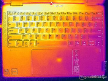 Las temperaturas superficiales son más cálidas en la mitad izquierda del chasis que en la derecha, con las zonas más cálidas y más frías alcanzando los 38 C y 27 C, respectivamente. Lamentablemente, la región cálida se encuentra cerca de las teclas WASD, lo que resulta desfavorable a la hora de jugar o teclear. En comparación, el Dell Inspiron 14 7445 2 en 1 tiene su región más cálida cerca del centro del teclado donde las palmas y los dedos no descansan. Aún así, nunca encontramos que el Lenovo fuera incómodamente cálido durante su uso.