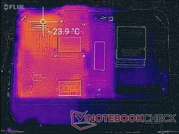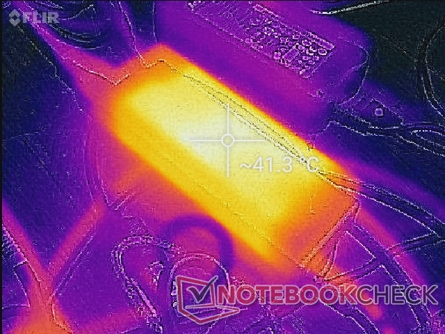 Los puntos calientes de la temperatura de la superficie están más cerca de la esquina inferior derecha. Como la tableta es bastante gruesa, los puntos calientes son generalmente pequeños y no se calientan tanto. Pudimos medir un máximo de apenas 38 C cuando se ejecutaban cargas de procesamiento altas durante periodos prolongados.