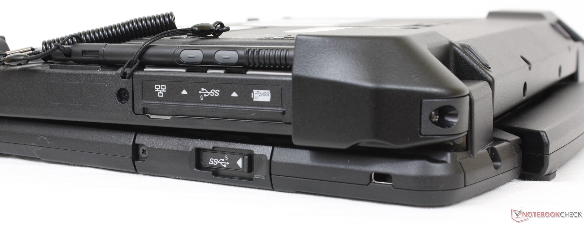 Panasonic ofrece una amplia variedad de accesorios que se conectan a la parte trasera de la tableta o al borde inferior, como la base de teclado opcional. Por ejemplo, un lector de códigos de barras, un lector de SmartCard, un adaptador LAN, un SSD OPAL, y mucho más.