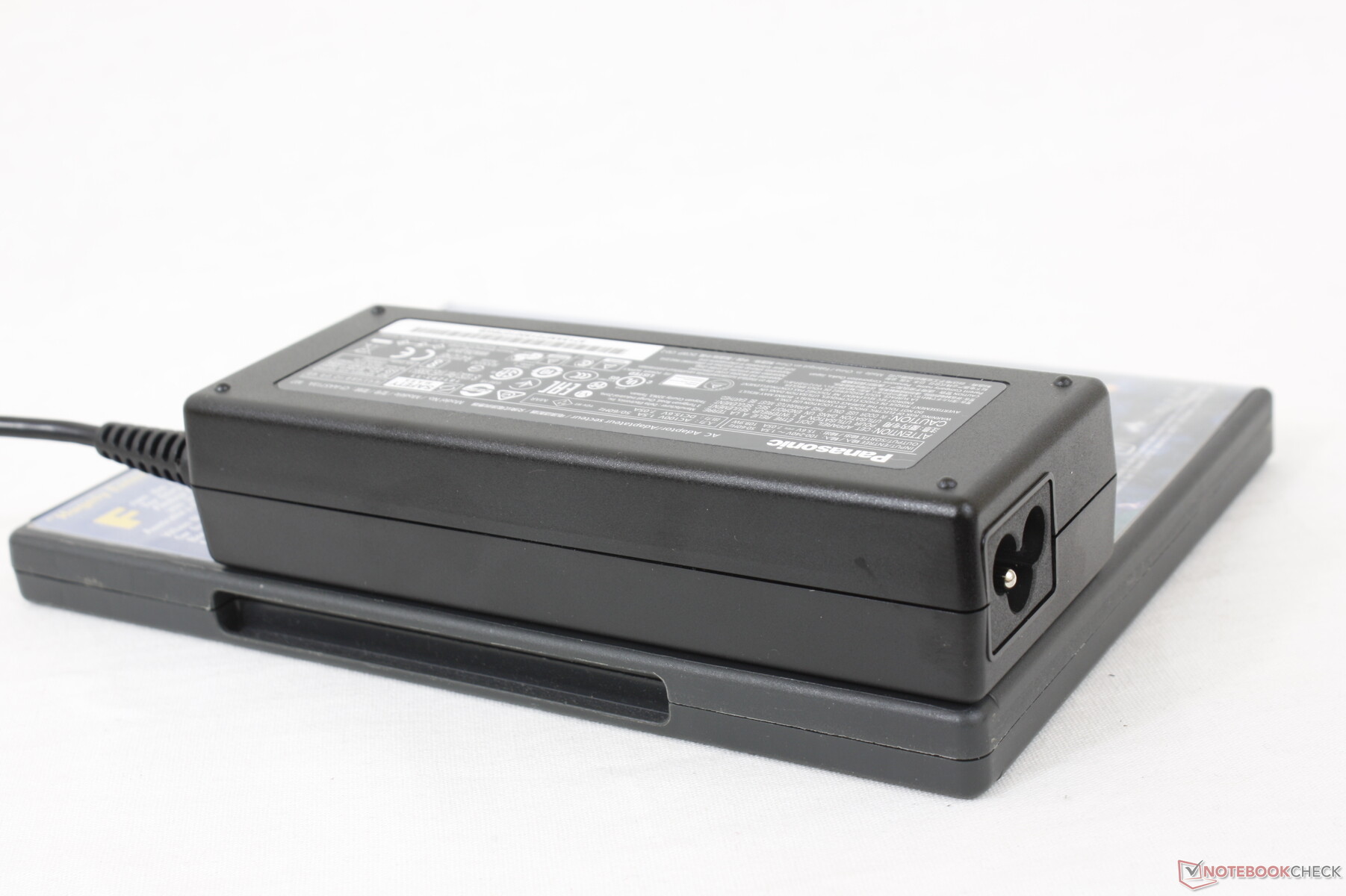 El adaptador de CA pequeño-mediano (~14,3 x 5,3 x 3,2 cm) tiene una potencia máxima de 109,9 W.